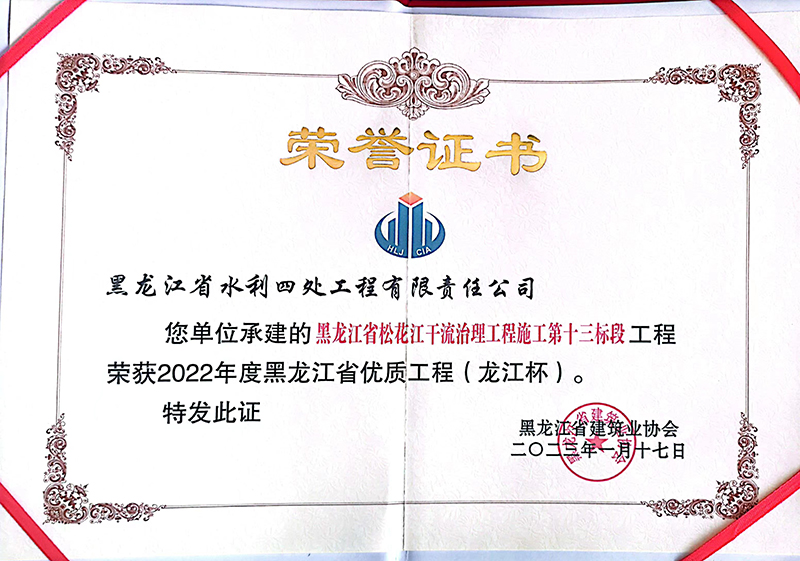 黑龙江省优质开云官方网页版官网(龙江杯)获奖证书